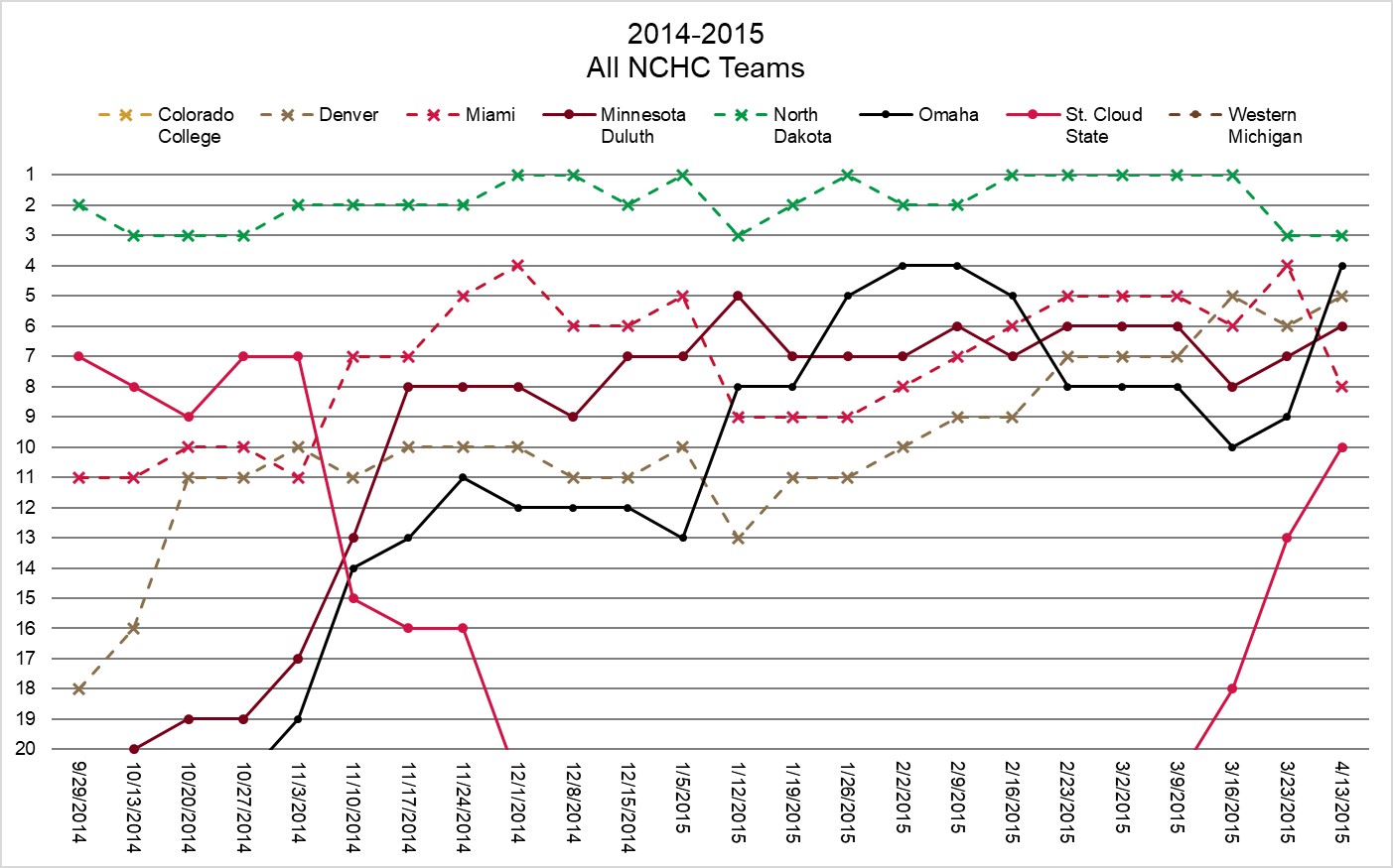 2014-2015 November 6, 2019 1403 × 875 Data and Graphs and Charts, Oh My: NCHC in the USCHO Poll through the Years 2014-2015: The NCHC started to gain a foothold in the minds of voters with a steady climb. The NCHC ended the year with five top-10 teams.